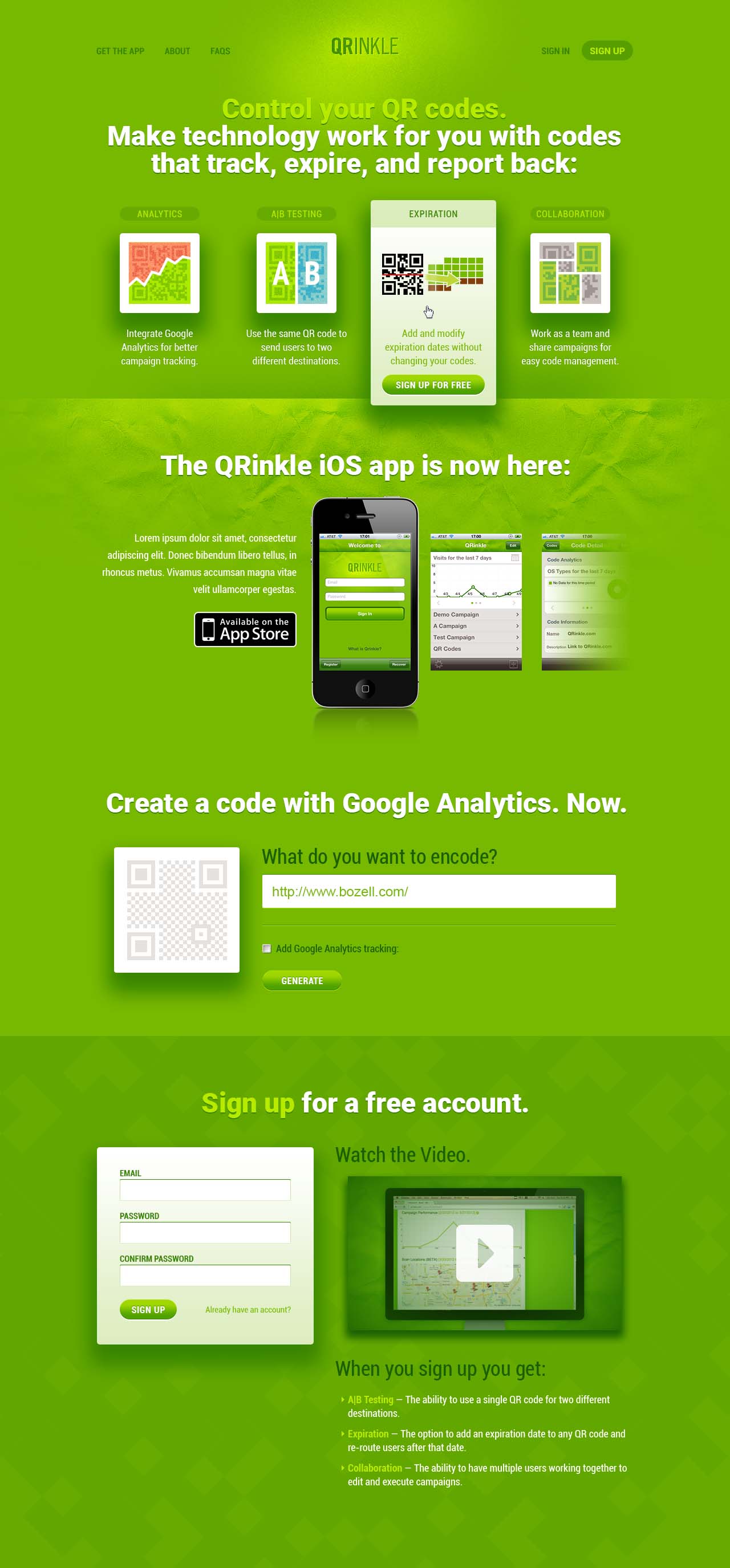 QRinkle was about five years early. The digital team at Bozell developed a free product that added tracking, analytics, expiration dates, and back-end updating to QR codes. I had the pleasure of naming the product, designing the identity and website, and art-directing a simple iOS app.